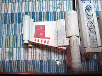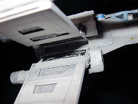 Detailing work. Here is a picture of the back of the studio Hero model. If you look at the trench of the back of the wings you will see a thin rod going the length of the wing. The kit doesn't have that bit, so I cut some small brass rod and added it myself.